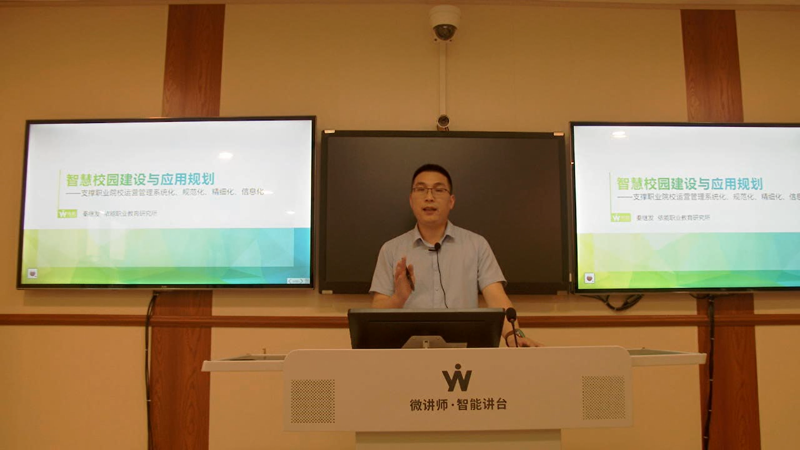 依能職業(yè)教育研究所研究員秦繼發(fā)作了《智慧校園建設(shè)及應(yīng)用規(guī)劃》的分享,秦老師從智慧校園整體架構(gòu),智慧校園平臺如何支撐學(xué)校教務(wù)教學(xué)管理、數(shù)據(jù)分析與決策,以及如何與學(xué)校各種物聯(lián)網(wǎng)整合應(yīng)用等方面作了詳細(xì)介紹,為參會學(xué)校提供建設(shè)思路。
