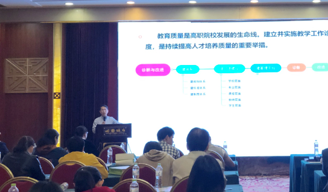 廣西職業(yè)教育發(fā)展研究中心常務(wù)副主任、南寧師范大學(xué)職業(yè)技術(shù)教育學(xué)院院長(zhǎng)王屹作了《以診改為抓手,全面提高職業(yè)院校人才培養(yǎng)質(zhì)量》報(bào)告。王屹院長(zhǎng)結(jié)合廣西職業(yè)院校教育教學(xué)質(zhì)量保證體系建設(shè)開(kāi)展工作基本情況、各校質(zhì)量保證體系建設(shè)情況、特色與亮點(diǎn)、診改運(yùn)行成效檢驗(yàn)、存在問(wèn)題進(jìn)行了介紹。并提出了進(jìn)一步推進(jìn)廣西職業(yè)院校診改的工作策略:一是進(jìn)一步解放思想,實(shí)事求是;二是堅(jiān)持問(wèn)題導(dǎo)向,求真務(wù)實(shí);加快信息化建設(shè),優(yōu)化管理。強(qiáng)調(diào)學(xué)校應(yīng)摒棄“等、靠、要”思想,作為責(zé)任主體,應(yīng)深入推進(jìn)學(xué)校內(nèi)部質(zhì)量保證體系建設(shè)工作,提升職業(yè)教育質(zhì)量,辦出人民滿(mǎn)意的職業(yè)教育。