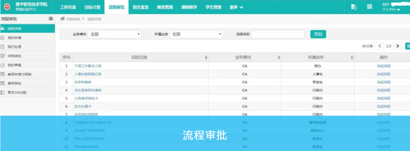 隨著信息化建設(shè)的日益深入,部門間的信息溝通與協(xié)同工作越來(lái)越重要。如果不同機(jī)構(gòu)、上下級(jí)部門溝通不暢容易導(dǎo)致辦事效率低,將會(huì)嚴(yán)重影響學(xué)校日常管理。對(duì)于學(xué)院各部門工作中存在的一些需要逐級(jí)審核審批的事務(wù)、多部門協(xié)同,如公文流程辦理、教職工請(qǐng)假、合同審批、公務(wù)接待等,晉中職業(yè)技術(shù)學(xué)院結(jié)合規(guī)章制度、實(shí)際情況,將學(xué)院過(guò)去一部分通過(guò)紙質(zhì)簽字審批的流程提取出來(lái),通過(guò)表單流程協(xié)作,靈活定制表單樣式及流程,實(shí)現(xiàn)了學(xué)院無(wú)紙化辦公,使得各種審批手續(xù)變得簡(jiǎn)單、快捷、規(guī)范,方便提取歷史數(shù)據(jù)統(tǒng)計(jì)進(jìn)行分析。