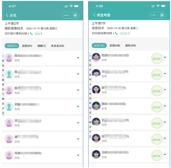學生人數(shù)多,紙質(zhì)點名冊凌亂無頭緒?傳統(tǒng)刷卡、指紋考勤時間長,影響上課效率?出勤率、缺勤率統(tǒng)計繁瑣,令人頭疼?這些對于四川省南充師范學校來說都不是問題!上課前,任課教師通過“YN智慧校園平臺”App在課堂實時點名,App根據(jù)課表自動判斷教師當前所授課程以及對應(yīng)的學生名單,教師只需手指輕點屏幕即可完成點名,高效準確,以便及時考查學生的到課情況,掌控課堂紀律,促使學生主動積極到課學習。遲到缺課清晰明了,考勤數(shù)據(jù)實時共享,管理更方便。