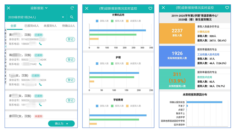 學(xué)校領(lǐng)導(dǎo)、專業(yè)部負(fù)責(zé)人可通過(guò)平臺(tái)的手機(jī)端或網(wǎng)頁(yè)端,實(shí)時(shí)掌控迎新情況,對(duì)異常情況進(jìn)行有效監(jiān)控,提高報(bào)到工作的效率。