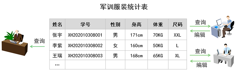 學校各工作流程中常用的數(shù)據(jù)表單可事先定義,使用時直接引用,實現(xiàn)多人對同一張表操作,如審批、查詢、修改等,減少文檔版本,信息登記及時、準確,以提高工作效率。學校常見的數(shù)據(jù)表有班費使用臺賬、工會福利物品發(fā)放管理、軍訓(xùn)服裝管理等,比如學校在征訂軍訓(xùn)服裝時,需要收集學生的身高體重等信息,校服管理負責人創(chuàng)建一個“軍訓(xùn)服裝統(tǒng)計表”,各班主任老師、行政后勤領(lǐng)導(dǎo)根據(jù)權(quán)限錄入或查看統(tǒng)計信息。