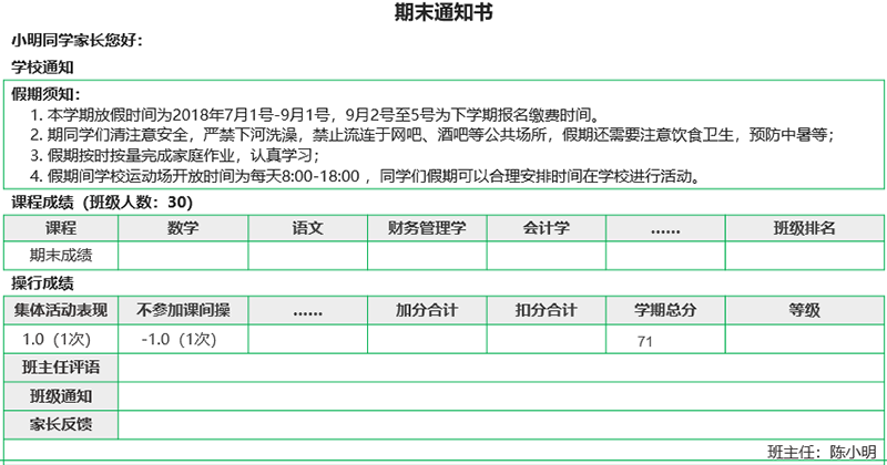 智慧校園平臺中應(yīng)嵌入基于平臺業(yè)務(wù)的快速開發(fā)工具,以便于向有平臺二次開發(fā)需求的學校提供無代碼、可視化的二次開發(fā)服務(wù),在降低開發(fā)成本,提高開發(fā)效率的同時,也能適應(yīng)不同學校個性化和未來業(yè)務(wù)變化的需求。通過可視化快速開發(fā)工具開發(fā)出的應(yīng)用基于平臺數(shù)據(jù)與業(yè)務(wù),屬于與智慧校園平臺的天然整合業(yè)務(wù),對用戶使用來講,并不增加使用門檻。比如,根據(jù)各學校的業(yè)務(wù)需求,運用嵌入的可視化報表工具、OA流程引擎等工具快速定制開發(fā)個性化數(shù)據(jù)報表,下圖便是個性化的學生“期末通知書”。