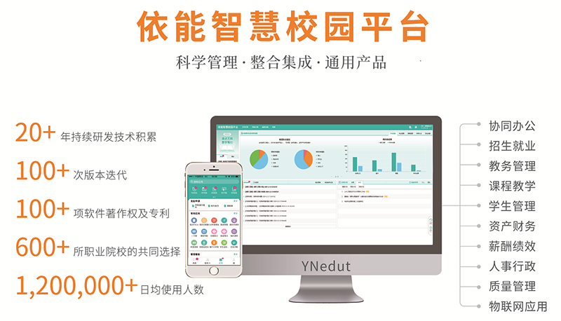 依能智慧校園平臺是學校通用智慧校園平臺軟件的最佳選擇。平臺是針對職業(yè)院校管理和教學業(yè)務(wù)特點、全面整合集成的大型應(yīng)用系統(tǒng),提供涵蓋招生就業(yè)、教務(wù)教學、學生管理、薪酬績效、人事行政、資產(chǎn)財務(wù)、質(zhì)量管理等一體化解決方案,覆蓋從招生到畢業(yè)的全過程管理。最主要的是,平臺基于科學管理、精細化管理原則設(shè)計,“引導(dǎo)管理和業(yè)務(wù)”而非“工具化平臺”,可以適應(yīng)學?,F(xiàn)在和未來的管理與業(yè)務(wù)變化,幫助學校實現(xiàn)管理系統(tǒng)化、規(guī)范化、精細化、信息化,最終提升學校的教學管理水平與效率。
