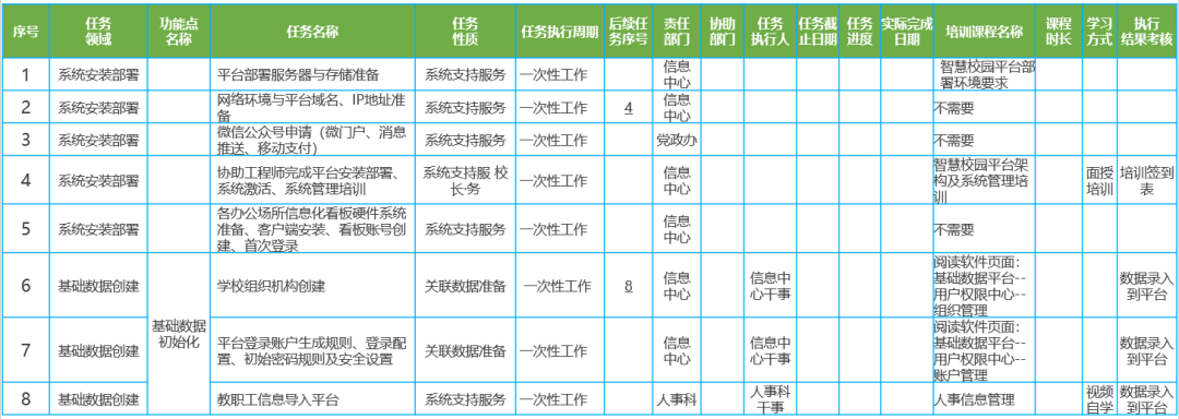 為推動(dòng)智慧校園的建設(shè)與應(yīng)用,學(xué)校應(yīng)設(shè)計(jì)推進(jìn)表,將智慧校園平臺(tái)推進(jìn)涉及到的工作按照功能點(diǎn)進(jìn)行分類,并將任務(wù)分解并落實(shí)到具體部門和責(zé)任人,細(xì)化工作目標(biāo),明確工作進(jìn)度,落實(shí)工作責(zé)任,有序推進(jìn)智慧校園建設(shè)及應(yīng)用。基于這樣一套智慧校園開局方法和對(duì)應(yīng)培訓(xùn)課程,確保學(xué)校將智慧校園平臺(tái)用起來。