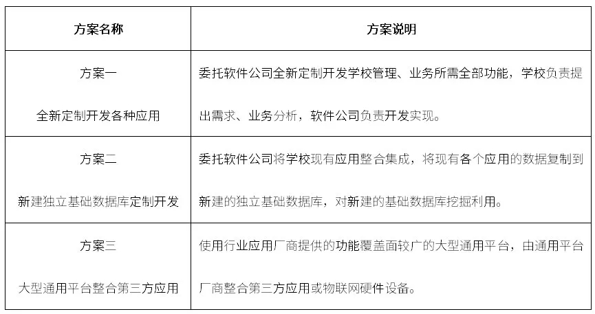 諾蘭認(rèn)為,只有發(fā)展到“應(yīng)用整合”階段,消除信息孤島,實(shí)現(xiàn)單點(diǎn)登錄、信息共享、數(shù)據(jù)一致,信息化才能全面支撐并深入融合組織的管理和業(yè)務(wù)應(yīng)用。因此,進(jìn)入“應(yīng)用整合”階段是信息化對學(xué)校各項工作全面推動的真正起點(diǎn)。已經(jīng)處于“控制階段”的職業(yè)院校,可能存在教學(xué)、學(xué)生管理、辦公OA等各種業(yè)務(wù)應(yīng)用系統(tǒng)(成員系統(tǒng))由多家軟件廠商提供的情況。各個系統(tǒng)的使用情況也各有差異,有的部分系統(tǒng)使用良好,有的基本沒有用。職業(yè)院校應(yīng)找到正確的整合集成智慧校園平臺建設(shè)的路線方案,以切實(shí)通過信息化平臺助力教學(xué)管理,提升學(xué)校競爭實(shí)力。“整合集成分為淺度整合和深度整合。淺度整合共享的數(shù)據(jù)種類少、數(shù)據(jù)量小,主要為組織機(jī)構(gòu)、用戶信息、核心業(yè)務(wù)數(shù)據(jù)等少量數(shù)據(jù)共享。深度整合共享的數(shù)據(jù)種類多、數(shù)據(jù)量大,整合的應(yīng)用系統(tǒng)間存在密切的數(shù)據(jù)交換、業(yè)務(wù)關(guān)聯(lián)?!闭霞傻穆肪€方案有三種,如表1所示。其中,方案一“全新定制開發(fā)各種應(yīng)用”鮮有成功案例,基本不再被采用;“新建獨(dú)立基礎(chǔ)數(shù)據(jù)庫定制開發(fā)”和“大型通用平臺整合第三方應(yīng)用”是主要的兩種路線。
