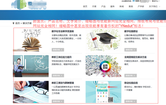 我司自行研發(fā)、設(shè)計(jì)并享有權(quán)益的教育業(yè)務(wù)官網(wǎng)(網(wǎng)址:www.ynedut.cn)于2016年9月正式上線運(yùn)行,這是我司對外宣傳的重要平臺,我司于2018年5月對該網(wǎng)站進(jìn)行了改版(改版前的網(wǎng)站以下簡稱“舊網(wǎng)站”,改版后的網(wǎng)站以下簡稱“新網(wǎng)站”)。近期發(fā)現(xiàn),我司網(wǎng)站的版面、結(jié)構(gòu)、內(nèi)容、圖片等被多家同行業(yè)網(wǎng)站非法抄襲、盜用、仿冒、剽竊,這種非常惡劣的行徑嚴(yán)重侵犯了我司網(wǎng)站、產(chǎn)品及解決方案等相關(guān)技術(shù)資料的著作權(quán)和所有權(quán),對我司的信譽(yù)及客戶的利益造成了侵害。