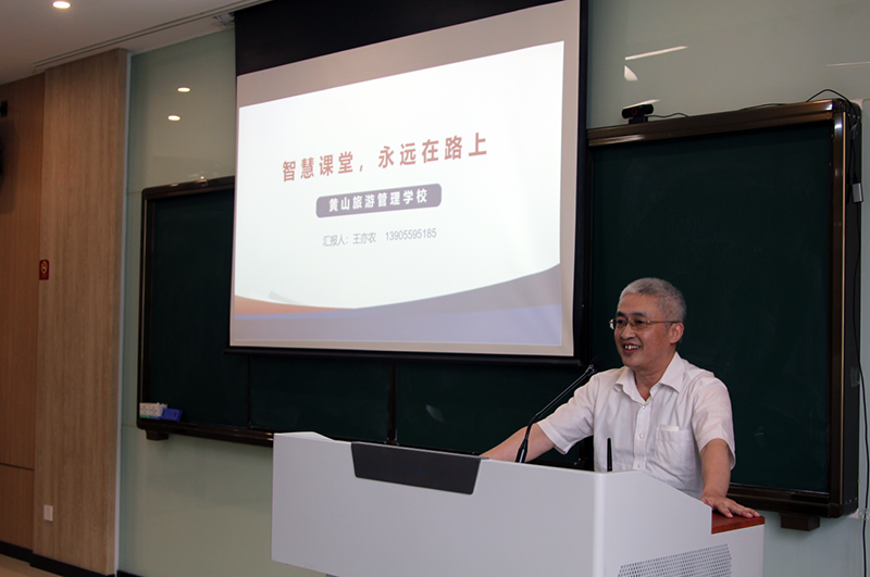黃山旅游管理學(xué)校信息中心主任王亦農(nóng)在會(huì)上從學(xué)校智慧校園建設(shè)典型應(yīng)用、信息化教學(xué)典型應(yīng)用、信息化教學(xué)工具應(yīng)用等方面作了經(jīng)驗(yàn)分享,他表示校園智慧化建設(shè)是學(xué)校建設(shè)的重要組成部分,也是一個(gè)長期的過程,智慧課堂,永遠(yuǎn)在路上。