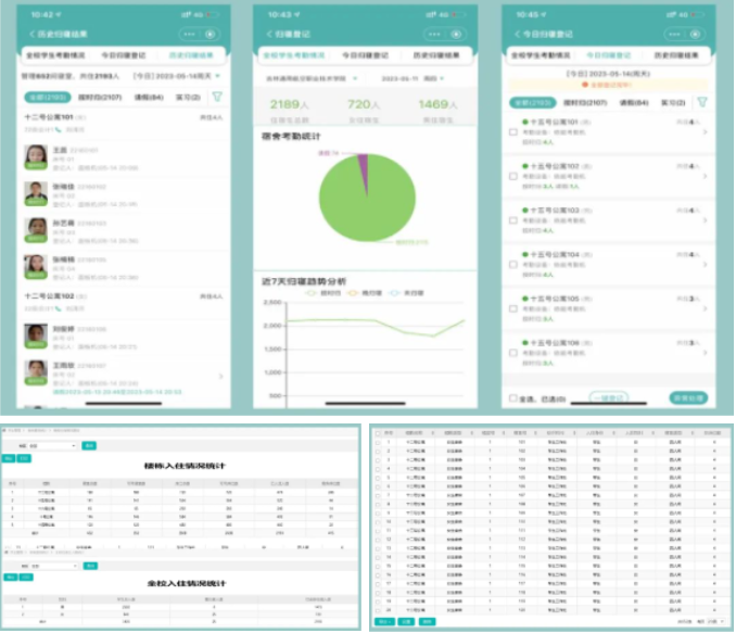 學(xué)院信息中心通過大量調(diào)研,在學(xué)生工作處的大力配合下,在學(xué)生公寓各樓層分別安裝人臉識別面板機、紅外線測溫設(shè)備和智慧展示大屏。在前端智慧展示大屏上,歸寢情況統(tǒng)計、請假人員信息、異常情況告警清晰可見;在宿管系統(tǒng)PC端后臺,管理人員可對宿舍樓棟及寢室信息維護、宿舍安排、入住情況查詢、宿舍考勤等進行統(tǒng)一管理;在手機App上可實時查看各公寓、班級、寢室歸寢人員統(tǒng)計,精準(zhǔn)掌握學(xué)生公寓管理全過程。