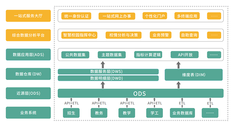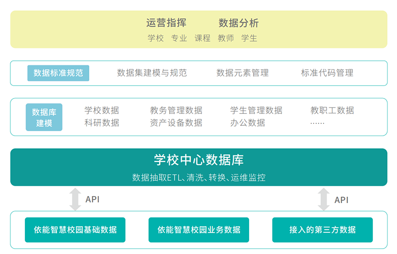 依能數(shù)據(jù)中臺(tái)使用ETL工具從智慧校園平臺(tái)業(yè)務(wù)系統(tǒng)抽取數(shù)據(jù),經(jīng)過(guò)數(shù)據(jù)清洗、轉(zhuǎn)換后安全存儲(chǔ)在學(xué)校統(tǒng)一的中心數(shù)據(jù)庫(kù),按需求對(duì)數(shù)據(jù)進(jìn)行加工、建模后使用,以實(shí)現(xiàn)即席查詢(xún)、數(shù)據(jù)上報(bào)、綜合數(shù)據(jù)分析與展示等應(yīng)用,通過(guò)數(shù)據(jù)分析發(fā)現(xiàn)業(yè)務(wù)問(wèn)題,從而優(yōu)化管理與教學(xué)工作,提升學(xué)校整體管理和教學(xué)的水平和質(zhì)量。