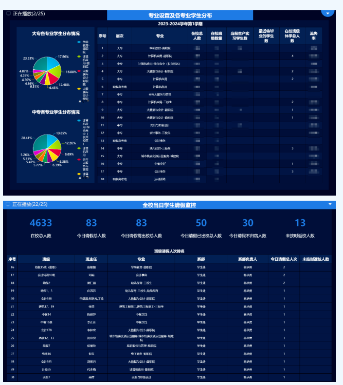 通過學(xué)生工作管理的智慧應(yīng)用,智慧校園平臺(tái)以學(xué)生在校期間行為表現(xiàn)、學(xué)習(xí)表現(xiàn)、過程評(píng)價(jià)、校園活動(dòng)等實(shí)時(shí)數(shù)據(jù)為基礎(chǔ),比如個(gè)人學(xué)業(yè)分析及預(yù)警、學(xué)生課程成績表現(xiàn)、學(xué)生個(gè)人操行考核情況、學(xué)生出勤情況,進(jìn)行多維度數(shù)據(jù)分析,形成學(xué)生在校期間的大數(shù)據(jù)。曲靖財(cái)經(jīng)學(xué)校管理部門和老師可通過顯示屏或手機(jī)實(shí)時(shí)查看相關(guān)信息,第一時(shí)間掌握學(xué)生動(dòng)態(tài)數(shù)據(jù),及時(shí)跟進(jìn)加強(qiáng)管理,調(diào)整教育教學(xué)行為,實(shí)現(xiàn)教學(xué)質(zhì)量的品質(zhì)提升。