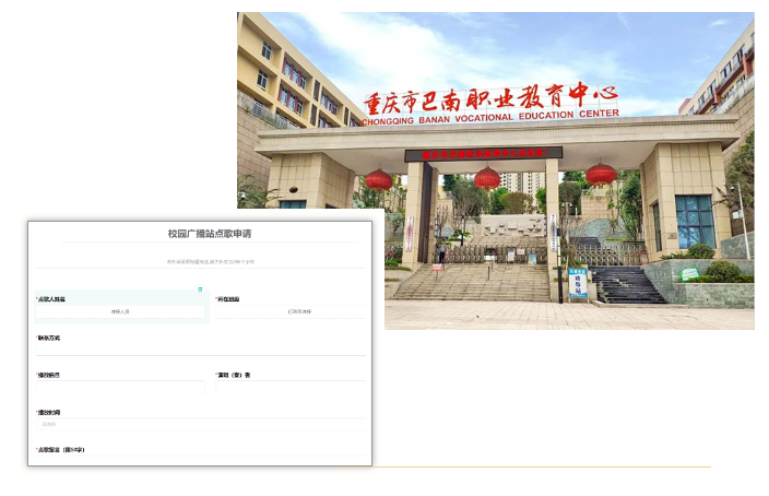 重慶市巴南職業(yè)教育中心通過(guò)BPE開(kāi)通校園廣播點(diǎn)歌通道,師生通過(guò)手機(jī)便可填寫(xiě)點(diǎn)歌申請(qǐng),還可附上祝福語(yǔ),電臺(tái)管理者線上審核。該流程上線后立即受到全校師生的熱烈歡迎,共有700余條祝福傳遍校園的每一個(gè)角落。